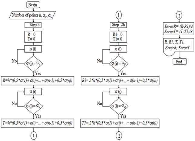 To develop the calculation of the definite integral, an algorithm [Figure 5] which allowed both the toughness and the resilience to be determined using numerical methods was proposed. The trapezoids method [25] was used through the Equation (4) to calculate the area under the stress versus strain curve. In addition, an algorithm also calculate the error occurring in the computation (Equation (5)].