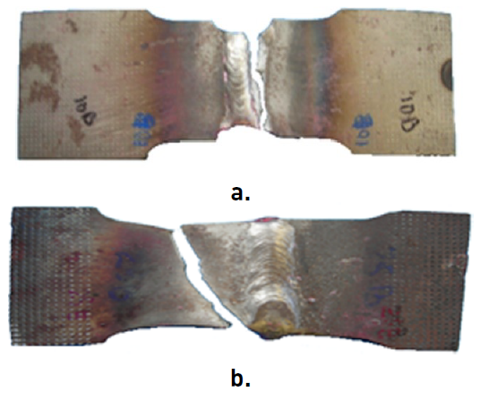 Four welded tensile specimens were tested, in order to know the mechanical properties of the joint. To determine the quality of the joint, it was used as a criterion that the failure of the welded specimen must occur in the heat affected zone (HAZ) and not in the welded metal, demonstrating in this way that the welded joint is well-built. Two of the specimens studied underwent a notch, to assess whether the break occurred in the filler material, which did not happen in any case. In Figure 6, the broken specimens are observed. A specimen on which a notch was performed [Figure 6a), the break occurred in the HAZ adjacent to the change section between the filler and the coarse grain zone of the HAZ. For the unnotched specimen [Figure 6b), the rupture started in the coarse grained HAZ and came after a tear of the specimen that reached the base material. In both cases, it was shown that the welded joint did not fail in the filler, but in the base material.