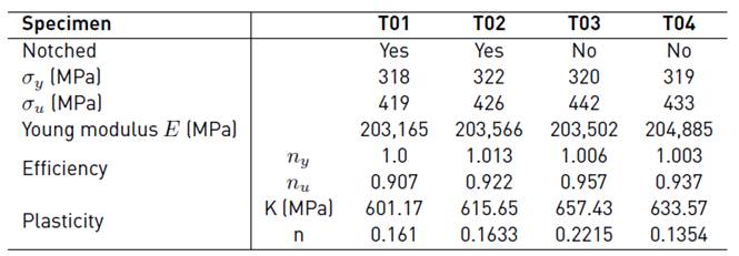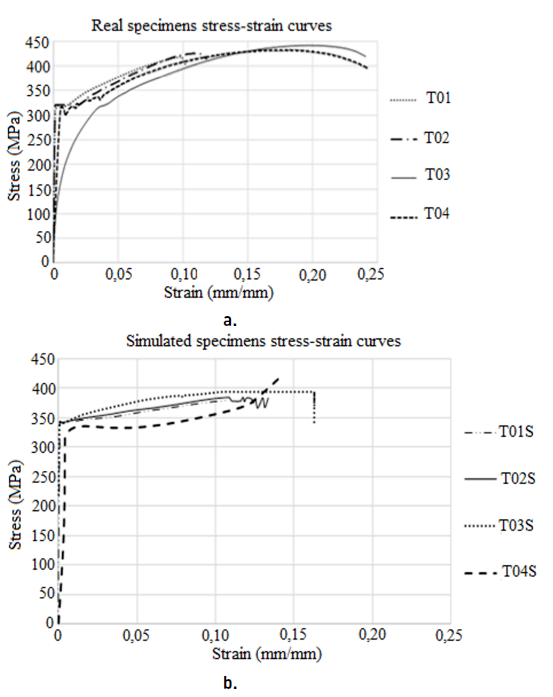 In Figure 7a, it is shown the graphs of stress σ versus the strain ε obtained from the tests performed at the four specimens, which are denoted as T01, T02, T03 and T04, respectively. It is observed that T01 and T02 specimens (those with indentations) failed before T03 and T04 specimens. Considering that the area under the curve stress versus strain is a measure of the toughness, and then it is possible to argue that the notch applied to the welded joint decreased the toughness. In other way, in Figure 7b are the stress-strain curves for simulated specimens.