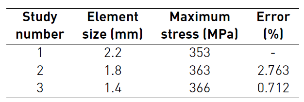 After conducting a mesh convergence study, it was decided to use an element of size 1.4 mm with a tolerance of 0.07 mm. The static numerical study was conducted with a load of 28.5 kN, corresponding to the value of the load in the yield limit of the material. The study results of convergence of the mesh are set forth in Table 6.
