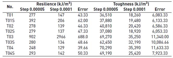 The above table shows that resilience is similar for almost all samples, that is, they all have the similar ability to recover their original dimensions after removing the load causing the deformation, except for the T03 specimen (the deviation is due to the slope of the elastic portion of the stress versus strain curve). The value of the resilience between real and simulated samples is similar. The biggest difference between the T03 and the T03S specimens occurs because the deviation in the second gradient elastic section of the stress versus strain curve does not occur. The difference can also be appreciated between samples T01 and T01S, because in the simulation, the elastic limit is greater than the actual test. The error calculated by the trapezoids method in the case of calculating the resilience ranges from 14.92% (specimen T03S) and 17.14% (specimen T04). It is observed that in the notched test pieces the toughness is lower than in those where there is no stress concentrator. It can also be noted that the values of toughness between the simulated and the actual samples are similar, except between specimens T04 and T04S.