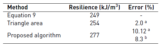 The resilience values obtained using three different methods from the specimen T01, are shown in Table 8. The determined maximum error is 10.12%, which can be considered permissible.