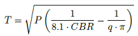 Where T is the total thickness of the pavement in inches (1 inch = 25.4 mm), P is the applied wheel load in pounds (1 lb = 4.4482 newtons), CBR is the California Bearing Ratio in percent, and q is the tire pressure in psi (1 psi = 6.8948 kPa).