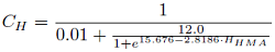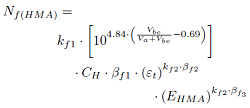 Where Nf(HMA) is the allowable number of axle-load applications; is the tensile strain at critical locations (in./in.); Vbe is the effective asphalt content by volume (%); Va is the air voids by volume (%); EHMA is the dynamic modulus of the HMA measured in compression (psi); kf1 , kf2 , and kf3 are the global field calibration parameters (kf1 = 0.007566, kf2 = -3.9492, kf3 = -1.281); βf1 , βf2 , and βf3 are local field calibration constants (1.0 by default). The thickness correction term (CH ) is dependent on the cracking type and for bottom-up cracking is given by Equation 31: