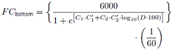 Where FCbottom is the bottom-up fatigue cracking (% of lane area); D bottom-up fatigue damage; C1 = 1.0; C’1 = (-2.0 · C’2); C2 = 1.0; C’2 = -2.40874 - 39.748 · (1 + HHMA )-2.856; and HHMA is the total thickness of the hot-mix asphalt (in.)