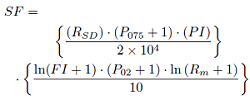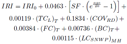Where IRI is the IRI at any given time (m/km); IRI0 is the initial IRI (m/km); SF is the site factor; age is the age of pavement in years; (TCL )T is the total length of transverse cracks (m/km); COVRD is the coefficient of variation of the rut depths (assumed to be 20%); (FC)T is the fatigue cracking in wheel path (% of total lane area); (BC)T is the area with block cracking as a percent of the total lane area (user input, not modeled by MEPDG); and (LCSNWP )MH is the length of moderate and high severity sealed longitudinal cracks outside the wheel path in meter per kilometer (user input, not modeled by MEPDG). The site factor is given by Equation 36: