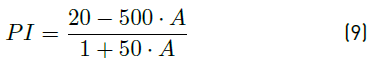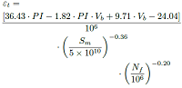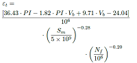 In both Equations 7 and 8, is the tensile strain, PI is the bitumen penetration index, Vb is the percentage of by bitumen volume in the mix, Sm is the stiffness modulus of the mix in N/m², and Nf is the number of repetitions to failure. Equation 9 defines the penetration index of the bitumen (PI):