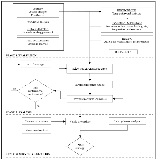 Figure 10 shows the conceptual schematic of the design process of MEPDG divided into three stages: evaluation, analysis, and strategy selection.