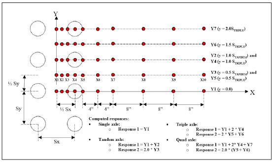 The method of analysis is the layered elastic theory, based on the JULEA program, except for non-linear analysis in the hierarchical Level 1 that uses the finite element method with the DSC2D program. The FEM is not fully calibrated and, in the short term, must be used for research only [25]. The traffic loading characterization uses load spectra of single, tandem, triple, and quad axles with multiple analysis points in the pavement structure to obtain the critical responses, as shown in Figure 11.