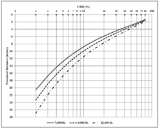 The empirical method based on the CBR test is simple to use but limited by the bounds of the experimental data. Engineers should be aware of the simplifications that lead from the CBR curves in Figure 2 to extrapolations like Figure 3 based on successive transformations of the traffic categories from “typical” axle loads to traffic intensities (trucks per day) and, after the AASHO Road Test, to repetitions of the equivalent single axle load (ESAL) of 18 kips [8].