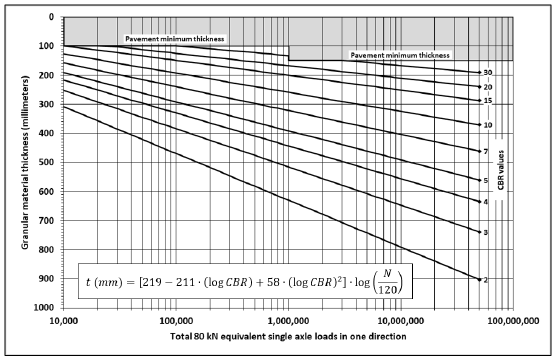 Figure 3 shows the 1979 National Association of Australia State Road Authorities (NAASRA) pavement design method for traffic intensities up to 50 million repetitions of the AASHTO standard axle of 80 kN and CBR values between two and 30 percent. Later on, Austroads updated this chart to design pavements with thin asphalt surfacing [9].