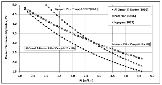 Roughness has a significant effect on PSI, and, at present, it is represented as the effect of the road profile over a standard vehicle, i.e., the International Roughness Index (IRI). For example, Figure 4 shows three correlations between PSI and IRI that substitute the use of Equation 2 .