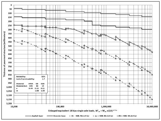 Figure 5 shows a design chart for flexible asphalt pavements with a reliability of 50%. The chart includes three values of resilient moduli of the subgrade: 1,500 psi, 3,000 psi, and 6,000 psi. The properties of the materials are summarized in the same chart. The thicknesses are in millimeters to ease comparison with Figure 3. The increase in layer thickness follows the same tendency for the method based on the CBR test. There are some discontinuities in the granular subbase thickness curves due to the minimum requirements of thicknesses for the asphalt and granular base layers in the AASHTO method.