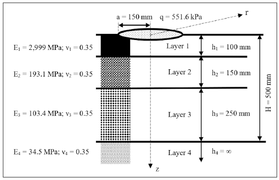 Finite element method (FEM): The layered theory has limitations such as the inability to capture the exact load geometry and boundary conditions. The evaluation of 2D, axisymmetric, and 3D FEM computations indicates that axisymmetric models give a reasonable solution in terms of computation time and capabilities to problems unaffected by boundary or discontinuity conditions [23]. The main advantage of FEM is that it considers elastic non-linear or viscoelastic materials, as well as complex load conditions. The disadvantages are that FEM requires more computational processing time and more information about the behavior of the materials.