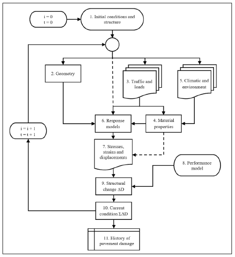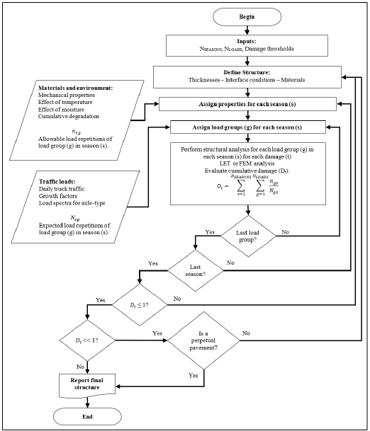 Figure 7 shows a flowchart for a mechanistic-empirical (M-E) pavement design procedure with multiple seasons (climatic sub-periods) and several load groups.