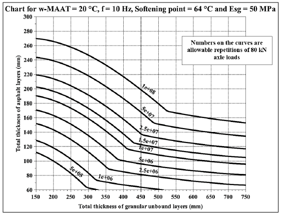 Figure 8 shows a design chart based on the Shell procedure for structures on a subgrade with Young’s modulus of 50 MPa and a weighted mean annual air temperature of 20°C. The asphalt mix has the mechanical properties of a dense-graded mix or S1-F1-100 in Shell codification. The horizontal axis represents the thickness of untreated base layers, and the vertical axis represents the thickness of the asphalt concrete layers. The chart includes nine traffic levels of repetitions of the 80 kN axle load. The rutting controls the structures with small thicknesses of unbound base and asphalt while the fatigue of the asphalt mix controls the thicker ones.
