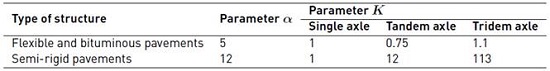 Where A is the “aggressiveness” of any given axle, K is used to take into account the kind of axle, P is the axle weight in kN, and α is a function of the type of material and structure. Table 1 summarizes the values of α and K for French conditions on regular and highly trafficked new flexible and semi-rigid pavements: