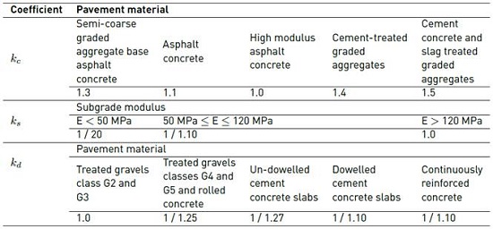 The calibration coefficient Kc adjusts the allowable strain or stress to the performance observed on pavements of the same type. The coefficient Ks is a reducing factor that takes into account the heterogeneity of the bearing capacity of the roadbed. The coefficient kd takes into account the effect of joints or shrinkage cracks in cement-treated materials or concrete slabs. Table 2 summarizes the suggested values of the coefficients for French conditions.