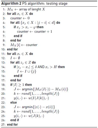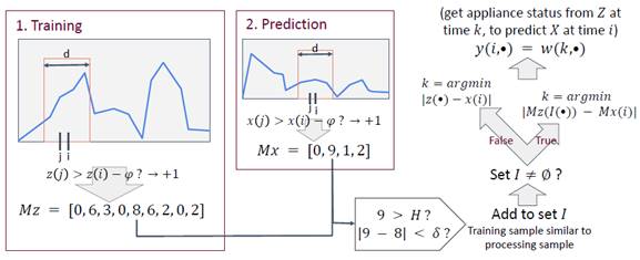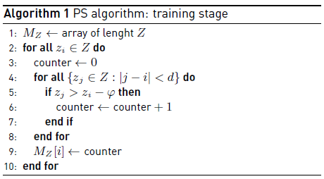 Algorithm 1 describes the training stage. This stage builds an array (MZ ), whose elements relate each consumption record on the training set to nearby records in the past and in the future. Each element of the array (zj ∈ MZ ) can be interpreted as the value of a feature of appliances signatures. The main loop (lines 2-10) iterates over each sample in the training dataset. In each iteration step, the algorithm counts how many consumptions from the time neighbour samples are similar to the consumption of the iteration step sample (nested loop in lines 4-8) . In line 9, the array (MZ ) is updated with the value of the counter, in the position corresponding to the consumption sample analyzed in the iteration. That array is used then, in the testing stage, to find samples whose consumption pattern is similar to the sample processed.