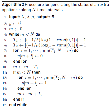 In lines 7-9, the OFF period of the appliance is added to the noise generated so far (components equal to zero). The case in which the number of time intervals simulated so far is greater than the desired length N is contemplated by the expression min (T1, N − m). In line 10, the value of m is modified according to the number of zeros added in lines 7-9. If the value of m is smaller than N, the ON period of the appliance is added to the noise generated so far (components equal to one) (lines 12-14). The case in which the number of time intervals simulated so far is greater than the desired length N is contemplated by the expression min (T2, N − m).