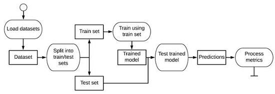 The first stage of the pipeline loads the dataset while the second split the dataset into a training set and a testing set. The training set is used to train the algorithm in its different instances and then the testing set is used to obtain the results of disaggregation. Finally, results are compared with the ground truth data (i.e. the test set) to compute a set of metrics.