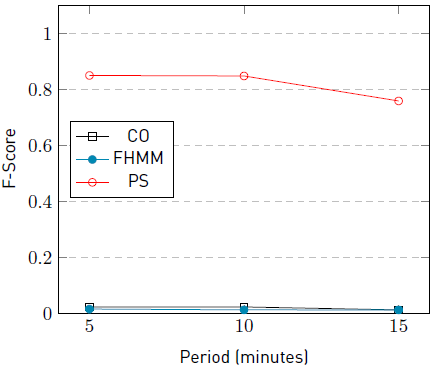 Results of PS in Figures 6 and 7 show that the appliance fridge, which presents the highest number of activations, remains unchanged along with the instances. In contstrast, results for CO and FHMM decrease along with the instances. On the other hand, the results of PS for the appliance kettle, which presents the lowest number of activations, shows that the F-score decrease as the sampling interval increases. It is expected to observe the same behaviour for the algorithms CO and FHMM, but the resulted F-score values are too low to conclude.