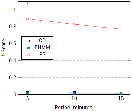 Tables 9-11 report the result of PS, CO, and FHMM on instances #5-5, #5-10 and #5-15. In these instances, apart of varying the sampling interval in 5, 10 and 15 minutes, the consumption of extra appliances to generate noise in the signal is added.