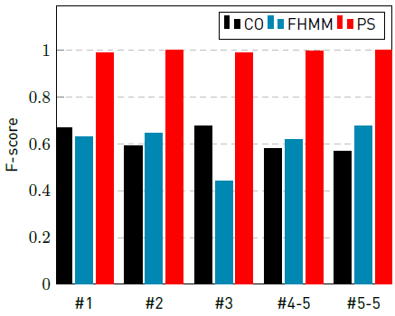 PS achieved very satisfactory results, significantly outperforming CO and FHMM, with improvements in the F-score up to 64% for instances #1-#4-5, up to 69% for sub-instances of instance #4 and up to 98% for sub-instances of instance #5.