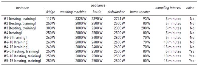 The first four instances were generated to analyze the efficacy of the proposed algorithm to solve different cases of energy consumption ambiguity. The fifth instance, apart from the presence of ambiguity, includes noise signals of appliances that are not intended to be disaggregated.