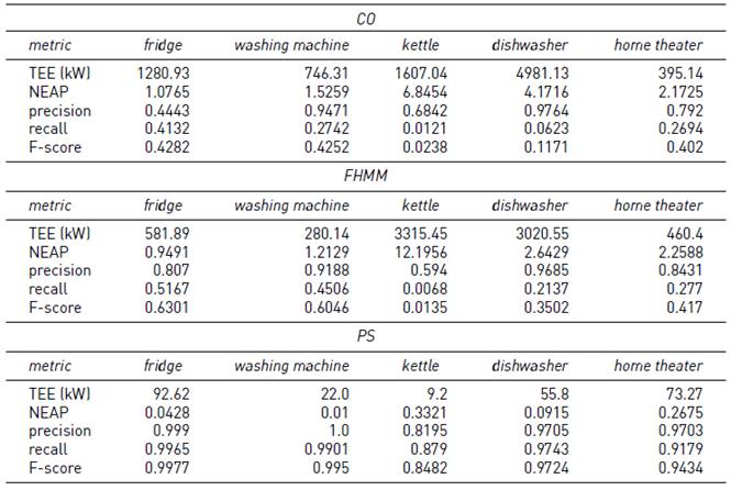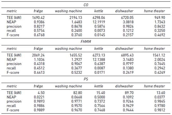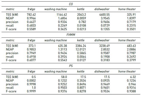 In the three sub-instances studied, the F-score of the PS algorithm was higher than the F-score of CO and FHMM. In addition, PS presented lower values than CO or FHMM for TEE and NEAP, in all cases. The F-score of CO decreased 9% (for fridge) and 13.5% (for home theatre), and did not vary for other appliances. TEE decreased up to one third for all appliances, while NEAP presented similar values. F-score for FHMM decreased up to 17% in all appliances but the washing machine (incremented 3.5%). TEE decreased up to one fifth in all appliances, and NEAP remained similar.