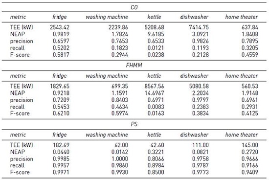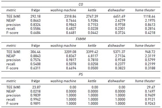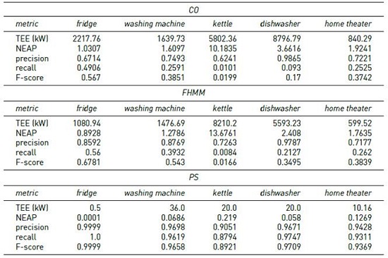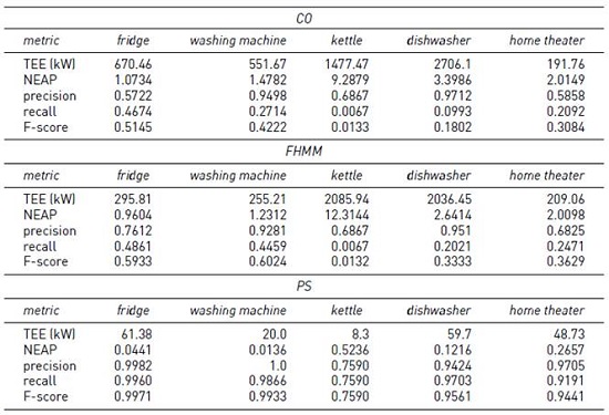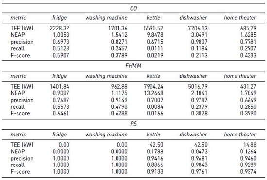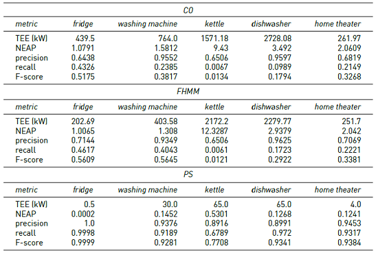 Relevant metrics were studied, including the precision of the prediction, recall (the conditional probability that the appliance is ON given that the prediction is ON); F-Score (the harmonic mean of precision and recall); the error of the total assigned energy consumption and the mean normalized error in assigned energy consumption.