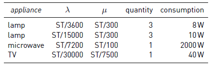 A series of zeros and ones is then generated for each extra appliance, according to the values of parameters λ and μ reported in Table 2 and the noise in the form of aggregate power of these extra appliances is calculated according to their power consumption values. For instance, for an interval of 5 minutes and three lamps of 8 W, λ = 300/3600 implies that the mean time OFF for these appliances is (1 − e−λ )−1≈ 12.5 intervals of 5 minutes, i.e., approximately 62 minutes and the mean time ON is (1 − e−μ )−1 = (1 − e−1 )−1≈ 1.58 intervals of 5 minutes, i.e., approximately 8 minutes. The same computation for lamps of 10 W results in a mean time OFF of 4 hours and 12 minutes. Similarly, λ = 1/100 gives a mean time OFF for the TV set of 8 hours and 22 minutes and μ = 1/25 gives a mean time ON of 2 hours and 7 minutes. Finally, λ = 1/24 gives a mean time OFF for the microwave of 2 hours and 2 minutes and μ = 3 gives a mean time ON of 5 minutes. The fact that the values of λ and μ are proportional to the length of the sampling intervals gives similar ON and OFF mean values for the 10 and the 15 minutes sample.