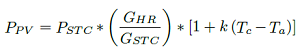 The output power of a photovoltaic system depends on the weather conditions at the installation site, Equation (1) is a simplified model of the output power [5].