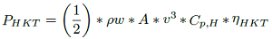 Where: PHKT is the power of the hydrokinetic turbine (HKT), (ρw) is the water density in kg/m3, HKT performance coefficient (Cp,H ), combined HKT-generator efficiency (ηHKT), HKT area (A) in m2, water flow velocity (v) in m/s and time (t) in seconds.