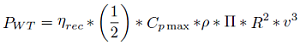 Where: PWT is the output power of the wind turbine, ηrec, is the efficiency of the controller (95%), in this case, the maximum MPPT power monitoring is included, ρ is the air density, R is the radius of the rotor, Cpmax is the power coefficient and v the wind speed [10, 46].