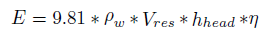 n = is the efficiency of the energy conversion, and must consider losses like turbine efficiency, generator efficiency, and hydrodynamic losses, usually 90% [47].