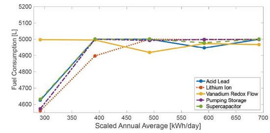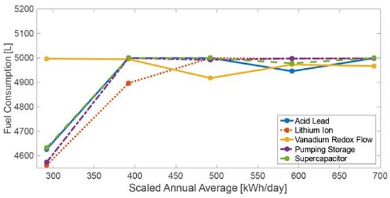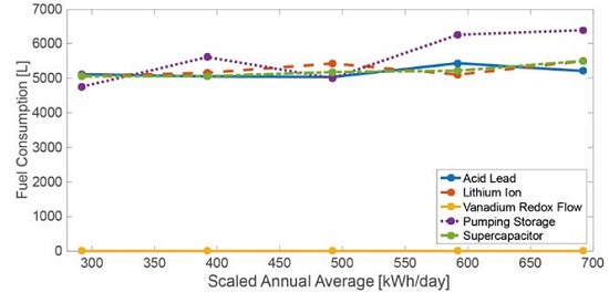 The objective of the sensitivity analysis is to verify the impact of the increased demand on the penetration of the diesel generator, using the different ESS proposed. Figure 10 shows the result of the sensitivity analysis under the CC control. It is obvious that, increasing demand also increases fuel consumption. However, the increase is different for each ESS. It can be noted that, the storage by pumping has the largest slope followed by the SC and LAB alternative; lithium batteries have a smaller slope. On the other hand, VRF presents an approximately constant behavior, being the one with the least sensitivity to the demand increase. The different behavior is due to the type of batteries and their energy and power density. In addition to increasing demand, excess energy from renewable sources is used in the analysis.