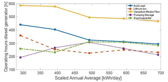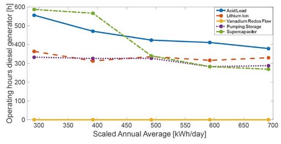 Finally, the sensibility study of scaled annual average [kWh] vs operating hours diesel generator [h] has shown novel results, since while the demand increases, the hours of operation of the diesel generator are reduced, due to the cost of fuel with respect to the cost of renewable sources. When calculating the optimal configuration, renewable sources are always prioritized, thus CO2 emissions will also be reduced. The acid lead storage systemhas shown a greater reduction of DG penetration under CC and LF control, followed by VRF, Li-ion. On the other hand, the storage of pumping and SC present an increase of DG penetration at the beginning and decreases at the end of interval.