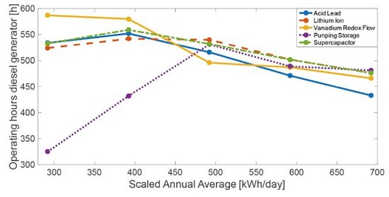 In addition, the sensibility analysisof scaled annual average [kWh/day] vs diesel consumption [L] has shown that while the demand increases, diesel consumption under the CC and LF controls increases in two phases, the first part exponentially and finally linearly. In the case of the CD control, it is always linear. In some higher demand values, diesel consumption decreases and this behavior is due to the possibility of using excess energy from renewable sources with their random resources and the type of ESS, because each storage system has different technical characteristics such as its power and energy densities.
