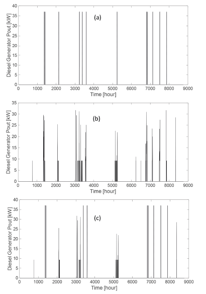 The output power of the diesel generator is shown in Figure 16. Lithium-Ion technology is taken as an example. It is observed that for the CC control the generator always starts at full load, in LF control it starts as required demand and the CD control is a combination of the CC and LF controls. It is important to mention that under the load cycle control the penetration of the DG is lower.