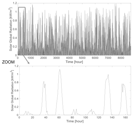 Renewable resources such as solar radiation have been taken from a weather station located at the study site. In Figure 3, the average daily radiation is presented for one year, the first 160 days are indicated in detail, it is observed that throughout the year there have been no considerable variations.