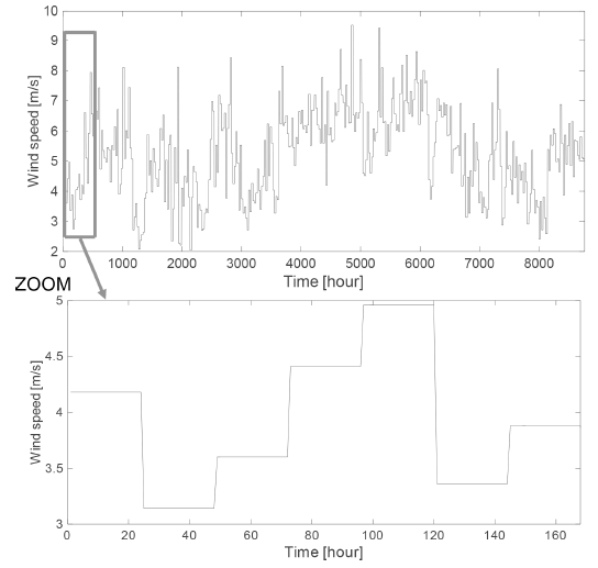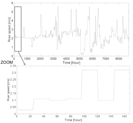 The water resource has been obtained using flow control measurements in a hydrological station installed at the study site, average river speeds have been achieved for one year. The river speed during a year and a detail of the first 160 days are shown in Figure 5. It can be observed that, for June until September, the water resource is lower compared to the other months of the year. Therefore, it is favorable for the system since the resource is complementary concerning the wind speed.