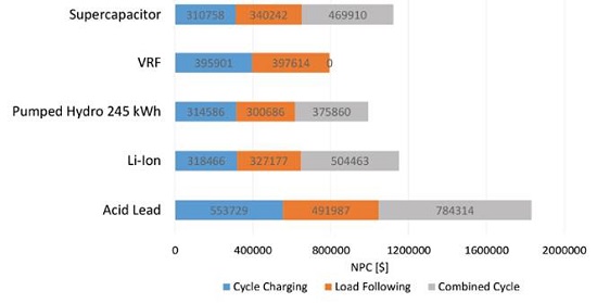 The VRF and the SC present greater penetration values of the DG both with optimal values under the CC control. However, the system with the lowest NPC penetration is the storage by pumping with NPC = $300,000; even though the DG penetration is still high with 644 h/yr and fuel consumption of 3,100 l/yr under the LF control. Therefore, the recommended system is Li-ion under CC control.