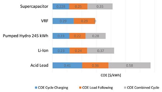 The simulation has been carried out using HOMER software. In each case the optimal sizing values are calculated, they serve as a comparison between the different energy storage systems proposed. The controls used in this article present novel results. For example, in the case of the LF control, the NPC is lower in the case of lead-acid batteries, lithium-ion, pumping storage and vanadium redox flow. In the case of the supercapacitor, the values remain similar for both the CC control and LF. On the other hand, the CD control presents different results than the other controls, in most systems the result of the NPC and COE are greater for this type of control. The results of the NPC are shown in Figure 7 and the results of the COE are presented in Figure 8, the COE has the same tendency as the NPC. In summary, the lowest NPC corresponds to the supercapacitor under cycle charging control whereas the lowest COE is for the pumped hydroelectricity under LF control.