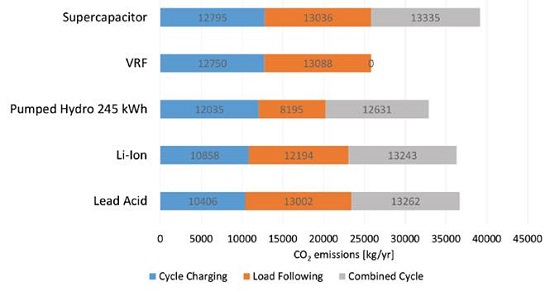 The results of CO2 emissions reflect the operation of the diesel generator because it is the only element that produces these emissions. Using the energy dispatch cycle charging, the systems that provide the most CO2 are: VRF and SC, followed by pump storage, Li-Ion and the least polluting are LABs. However, when using the load following energy dispatch, pump storage has shown the lowest level of CO2 emissions followed by Li-Ion and VRF batteries. It is worth mentioning that for the vanadium flow system it is not profitable to apply the combined control. Similarly, using the combined cycle it can be seen that the emissions produced by lead-acid batteries have decreased considerably and the emissions in pump storage have increased, the other systems still have high CO2 emissions. These results are the product of the ESS type, its response time to load peaks and the state of charge of each system. The results are shown in Figure 9. The system with the lowest CO2 emissions is pumped hydro under load following control.