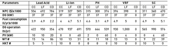 Table 2 shows the size optimization for the proposed systems. The result of the DG is the same for all systems (37 kW) except for VRF under CD control, since it is not economically viable. Regarding diesel consumption, lead-acid batteries under CD control have obtained a favorable result. However, to achieve this, the number of solar panels had to be increased to 20 kW and the number of WT to 86 raising the NPC to $784,000. On the other hand, lithium-ion batteries show a different result, under the CC control the lowest penetration of the DG has been obtained with 470 h/yr of operation and consumption of 4000 l/yr. Moreover, the NPC is relatively lower ($319,000) and it has been recommended not to use solar panels, therefore it has been used 10 WT and 10 HKT.