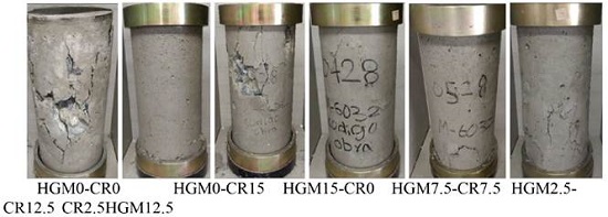 From Figure 1, it can be seen that the largest macrocrack is present in the specimen of mixture HGM0-CR0, which crosses the entire height of the cylinder. Similarly, the HGM15-CR0 mixture has macrocracks, but these do not completely cross the height of the cylinder. On the other hand, the cylinders of the HGM0-CR15, HGM7.5-CR7.5, HGM2.5-CR12.5, and CR2.5HGM12.5 mixtures which have a replacement of rubber, small cracks are observed in their surface, however, the definite trend of failure in the specimens is not detailed. This phenomenon can be explained by the low elasticity modulus of the cylinders that is mainly due to the addition of rubber, this is because this material has a very low Young´s modulus that enhances the capacity of deformation before cracking, and it also resists further propagation and coalescence of microcracks by decreasing the stress concentration similar to a damper, in agreement with [27]. This is how rubber replacement improves the deformation capacity of concrete before failure as well as mitigating the propagation and bonding of microcracks. Therefore, the width, height, and the number of cracks decrease as the percentage of rubber in the mixture increases, thus presenting a ductile fault. On the contrary, we observe that the specimen of the HGM15-CR0 mixture has a brittle fault very similar to the cylinder of the reference mixture. This similarity can be attributed to very similar values of the modulus of elasticity between the HGM and fine and coarse aggregates. Additionally, the HGM used have a higher density than rubber particles, therefore concrete with percentages of high addiction of this type of HGM will present brittle faults such as conventional concrete. It is observed, the addition of CR in prepared samples resulted in a positive synergetic effect with HGM.