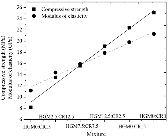 The compressive strength results are presented in Figure 2. According to experimental results, the compression strength of the mix prepared with CR and HGM specimens decreased and a full replacement of 15% fine aggregates by CR resulted in a decrease of 63% in the cylinders compression strength.
