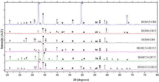 Furthermore, the characteristic peaks of calcite at the angular position 2θ = 34.40° can be seen in the XRD results of all mixtures [31]. The intensity of this characteristic peak and other low-intensity peaks increase as the percentage of HGM increases. The increase in calcite intensity is related to the increase of portlandite molecules. Inasmuch as calcite is produced from the chemical reaction of carbonation, in which portlandite reacts with carbon dioxide so that when there is a greater quantity of calcium hydroxide molecules, then high precipitation of CaCO3 is expected. Ettringite formation was not identified for mixtures HGM0-CR15 and HGM2.5-CR12.5, but it was evident for mixtures with a higher proportion of HGM, and this is because of the preferential reaction of the aluminates provided by this material. C3S was identified in all samples and β-C2S was identified in the HGM0-CR15 mixture as well. This indicates that the incomplete reaction of the main cement phases, at least up to 28 days of curing occurred. It should be noted that the peaks representing the formation of C-S-H (I) tend to show a higher intensity as the percentage of HGM increases. During the hydration process, silicic acid was formed on the surface of the HGM [28] therefore causing a pozzolanic reaction, in which the silicic acid gel reacts with calcium hydroxide and produces more hydrated calcium silicate molecules. Finally, mixtures with a larger portion of HGM tend to produce more peaks and greater intensity of katoite due to the greater magnitude of aluminate that can be obtained through the HGM, therefore it favors the precipitation of this C-A-S-H (calcium aluminium silicate hydrate).