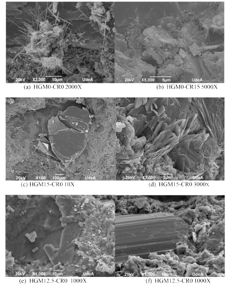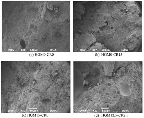 From Figure 6 , samples HGM0-CR15 and HGM12.5-CR2.5 have a larger number of pores compared to samples HGM0-CR0 and HGM15-CR0, which do not contain CR. Hence, it provides a means to visually confirm that the addition of CR increases the air trapped in the concrete mixture, thereby increasing the number of voids in the concrete cylinders as mentioned above.
